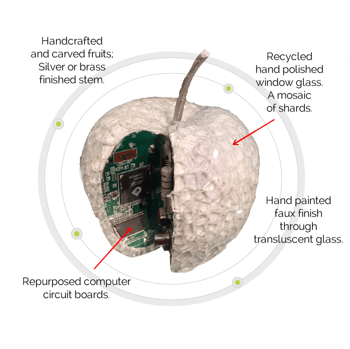 FRUIT BYTES! Our finely crafted and hand carved acacia apple is a one of a kind. Accented with brass trim and recycled computer boards. We... View full product details